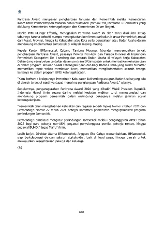 Menko PMK Muhajir Effendy, menegaskan Paritrana Award ini akan terus dilakukan setiap