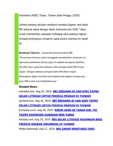 liputan6.com, Aug 26, 2019: BRI BERSAMA BI DAN KDEI TAIPEI
