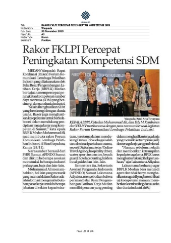 Title RAKOR FKLPI PERCEPAT PENINGKATAN KOMPETENSI SDM Media Name Waspada Pub. Date 30 November 2019 Page/URL A3 Media Type Koran Sentiment Positive Page 120 of 170.