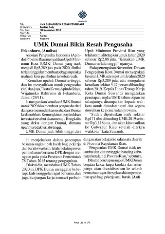 Title UMK DUMAI BIKIN RESAH PENGUSAHA Media Name Analisa Daily Pub. Date 30 November 2019 Page/URL 6 Media Type Koran Sentiment Positive Page 121 of 170.