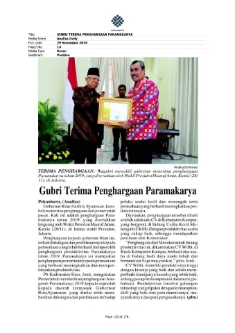Title GUBRI TERIMA PENGHARGAAN PARAMAKARYA Media Name Analisa Daily Pub. Date 29 November 2019 Page/URL 13 Media Type Koran Sentiment Positive Page 133 of 170.