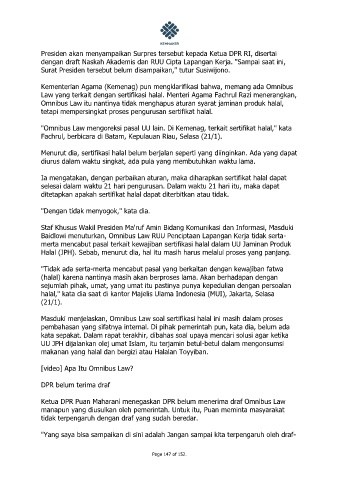 "Omnibus Law mengoreksi pasal UU lain. Di Kemenag, terkait sertifikat halal," kata