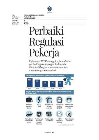 Title PERBAIKI REGULASI PEKERJA Media Name Media Indonesia Pub. Date 26 Oktober 2019 Page/URL 2 Media Type Koran Sentiment Positive Page 33 of 146.