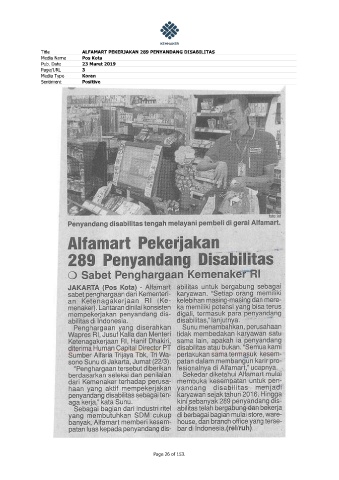 Title ALFAMART PEKERJAKAN 289 PENYANDANG DISABILITAS Media Name Pos Kota Pub. Date 23 Maret 2019 Page/URL 3 Media Type Koran Sentiment Positive Page 26 of 153.