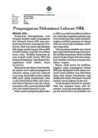 Title PENGANGGURAN DIDOMINASI LULUSAN SMK Media Name Pikiran Rakyat Pub. Date 22 Maret 2019 Page/URL 15 Media Type Koran Sentiment Positive Page 71 of 153.