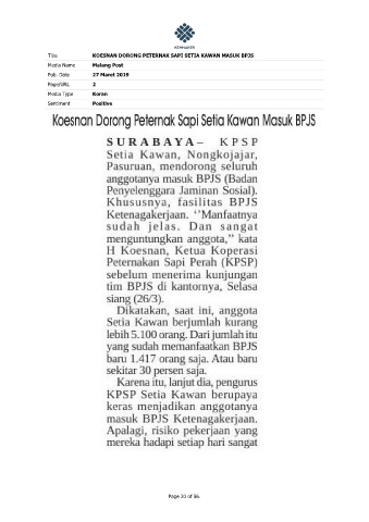Title KOESNAN DORONG PETERNAK SAPI SETIA KAWAN MASUK BPJS Media Name Malang Post Pub. Date 27 Maret 2019 Page/URL 2 Media Type Koran Sentiment Positive Page 20 of 56.