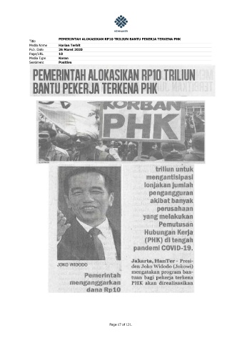PEMERINTAH ALOKASIKAN RP10 TRILIUN BANTU PEKERJA TERKENA PHK Title Media Name Harian Terbit Pub. Date 26 Maret 2020 Page/URL 10 Media Type Koran Sentiment Positive Page 17 of 121.