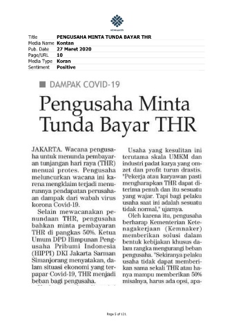 Title PENGUSAHA MINTA TUNDA BAYAR THR Media Name Kontan Pub. Date 27 Maret 2020 Page/URL 10 Media Type Koran Sentiment Positive Page 5 of 121.