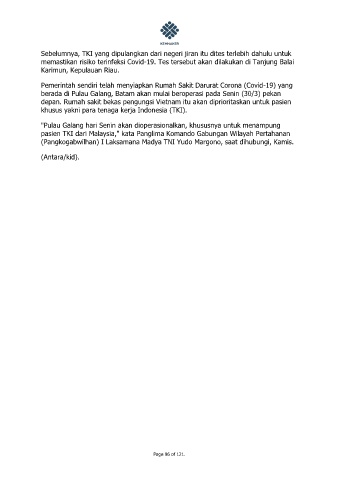 pasien TKI dari Malaysia," kata Panglima Komando Gabungan Wilayah Pertahanan
