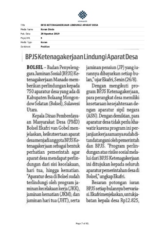 Title BPJS KETENAGAKERJAAN LINDUNGI APARAT DESA Media Name Koran Sindo Pub. Date 28 Agustus 2019 Page/URL 5 Media Type Koran Sentiment Positive Page 7 of 93.