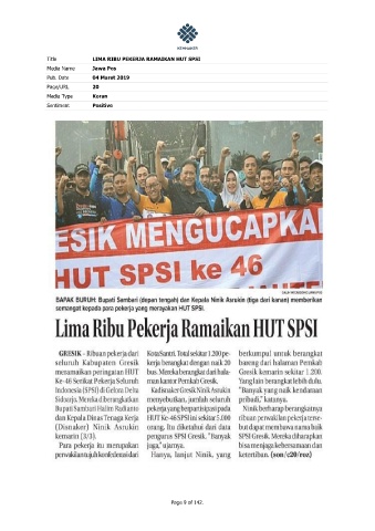 Title LIMA RIBU PEKERJA RAMAIKAN HUT SPSI Media Name Jawa Pos Pub. Date 04 Maret 2019 Page/URL 20 Media Type Koran Sentiment Positive Page 9 of 142.