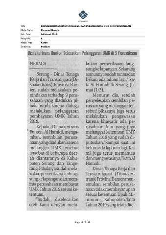 Title DISNAKERTRANS BANTEN SELESAIKAN PELANGGARAN UMK DI 9 PERUSAHAAN Media Name Ekonomi Neraca Pub. Date 04 Maret 2019 Page/URL 9 Media Type Koran Sentiment Positive Page 11 of 142.