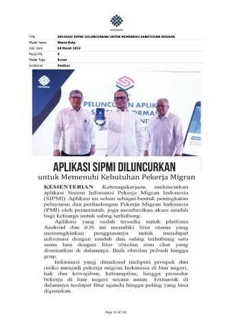 Title APLIKASI SIPMI DILUNCURKAN UNTUK MEMENUHI KEBUTUHAN MIGRAN Media Name Warta Kota Pub. Date 04 Maret 2019 Page/URL 3 Media Type Koran Sentiment Positive Page 13 of 142.