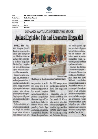 Title APLIKASI DIGITAL JOB FAIR DARI KECAMATAN HINGGA MALL Media Name Kedaulatan Rakyat Pub. Date 04 Maret 2019 Page/URL 3 Media Type Koran Sentiment Positive Page 20 of 142.