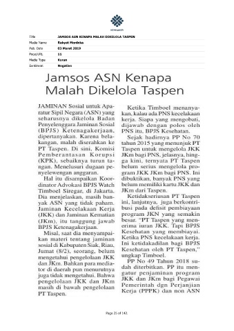 Title JAMSOS ASN KENAPA MALAH DIKELOLA TASPEN Media Name Rakyat Merdeka Pub. Date 03 Maret 2019 Page/URL 11 Media Type Koran Sentiment Negative Page 25 of 142.