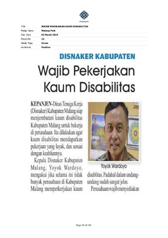 Title WAJIB PEKERJAKAN KAUM DISABILITAS Media Name Malang Post Pub. Date 03 Maret 2019 Page/URL 12 Media Type Koran Sentiment Positive Page 29 of 142.