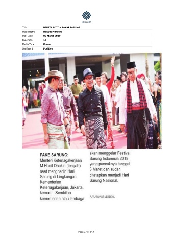Title BERITA FOTO - PAKAI SARUNG Media Name Rakyat Merdeka Pub. Date 02 Maret 2019 Page/URL 13 Media Type Koran Sentiment Positive Page 37 of 142.