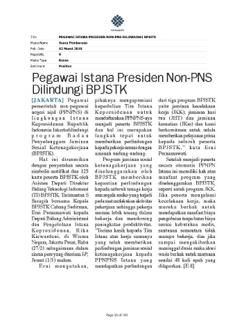 Title PEGAWAI ISTANA PRESIDEN NON-PNS DILINDUNGI BPJSTK Media Name Suara Pembaruan Pub. Date 02 Maret 2019 Page/URL 9 Media Type Koran Sentiment Positive Page 50 of 142.