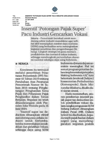 Title INSENTIF 'POTONGAN PAJAK SUPER' PACU INDUSTRI GENCARKAN VOKASI Media Name Ekonomi Neraca Pub. Date 15 Juli 2019 Page/URL 11 Media Type Koran Sentiment Positive Page 11 of 180.