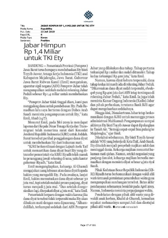 Title JABAR HIMPUN RP 1,4 MILIAR UNTUK TKI ETY Media Name Republika Pub. Date 15 Juli 2019 Page/URL 4 Media Type Koran Sentiment Positive Page 17 of 180.