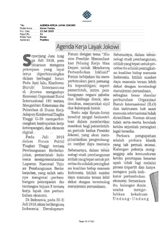 Title AGENDA KERJA LAYAK JOKOWI Media Name Koran Tempo Pub. Date 15 Juli 2019 Page/URL 11 Media Type Koran Sentiment Positive Page 19 of 180.