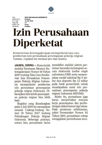 Title IZIN PERUSAHAAN DIPERKETAT Media Name Kompas Pub. Date 15 Juli 2019 Page/URL 14 Media Type Koran Sentiment Positive Page 24 of 180.