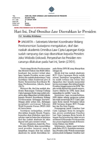 Title HARI INI, DRAF OMNIBUS LAW DISERAHKAN KE PRESIDEN Media Name Investor Daily Pub. Date 27 Januari 2020 Page/URL 5 Media Type Koran Sentiment Positive Page 9 of 163.