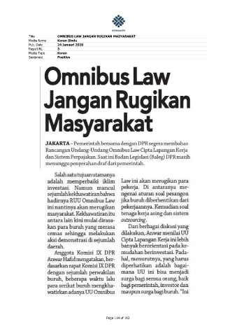 Title OMNIBUS LAW JANGAN RUGIKAN MASYARAKAT Media Name Koran Sindo Pub. Date 24 Januari 2020 Page/URL 3 Media Type Koran Sentiment Positive Page 114 of 163.