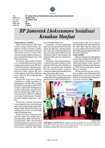 Title BP JAMSOSTEK LHOKSEUMAWE SOSIALISASI KENAIKAN MANFAAT Media Name Analisa Daily Pub. Date 24 Januari 2020 Page/URL 20 Media Type Koran Sentiment Positive Page 127 of 163.