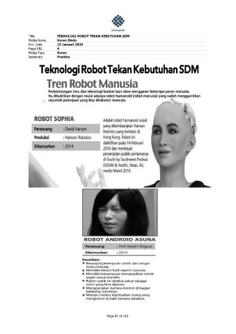 Title TEKNOLOGI ROBOT TEKAN KEBUTUHAN SDM Media Name Koran Sindo Pub. Date 25 Januari 2020 Page/URL 4 Media Type Koran Sentiment Positive Page 82 of 163.