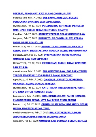 kontan.co.id, Feb 17, 2020: BURUH TOLAK OMNIBUS LAW CIPTA
