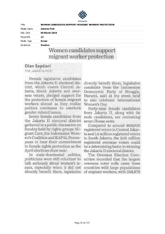 Title WOMEN CANDIDATES SUPPORT MIGRANT WORKER PROTECTION Media Name Jakarta Post Pub. Date 09 Maret 2019 Page/URL 12 Media Type Koran Sentiment Positive Page 35 of 137.