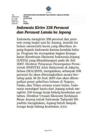 Title INDONESIA KIRIM 338 PERAWAT DAN PERAWAT LANSIA KE JEPANG Media Name Kompas Pub. Date 19 Juni 2019 Page/URL 5 Media Type Koran Sentiment Positive Page 9 of 57.