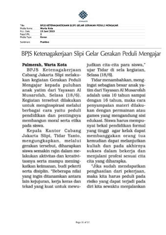 Title BPJS KETENAGAKERJAAN SLIPI GELAR GERAKAN PEDULI MENGAJAR Media Name Warta Kota Pub. Date 19 Juni 2019 Page/URL 2 Media Type Koran Sentiment Positive Page 11 of 57.