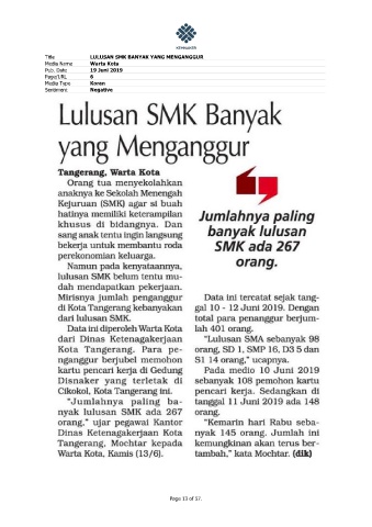 Title LULUSAN SMK BANYAK YANG MENGANGGUR Media Name Warta Kota Pub. Date 19 Juni 2019 Page/URL 6 Media Type Koran Sentiment Negative Page 13 of 57.