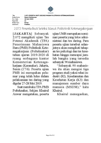 Title 2.072 PESERTA IKUTI SELEKSI MASUK POLITEKNIK KETENAGAKERJAAN Media Name Suara Pembaruan Pub. Date 18 Juni 2019 Page/URL 11 Media Type Koran Sentiment Positive Page 44 of 57.