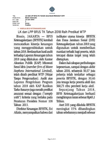 Title LK DAN LPP BPJS TK TAHUN 2018 RAIH PREDIKAT WTP Media Name Bisnis Indonesia Pub. Date 19 Juni 2019 Page/URL 7 Media Type Koran Sentiment Positive Page 6 of 57.