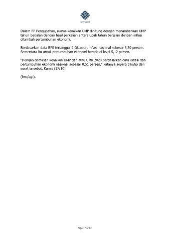 "Dengan demikian kenaikan UMP dan atau UMK 2020 berdasarkan data inflasi dan