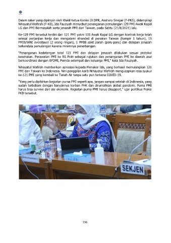 Nihayatul Wafirah memberikan apresiasi kepada Menaker Ida, yang berhasil memulangkan 121