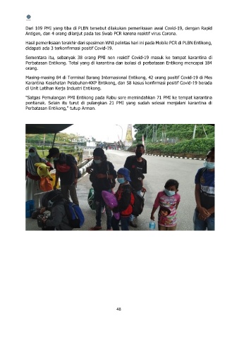 Sementara itu, sebanyak 38 orang PMI non reaktif Covid-19 masuk ke tempat karantina di