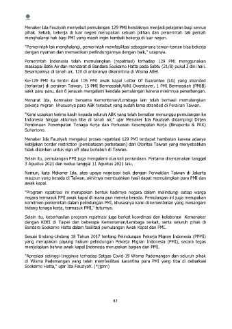 Pemerintah Indonesia telah memulangkan (repatriasi) terhadap 129 PMI menggunakan