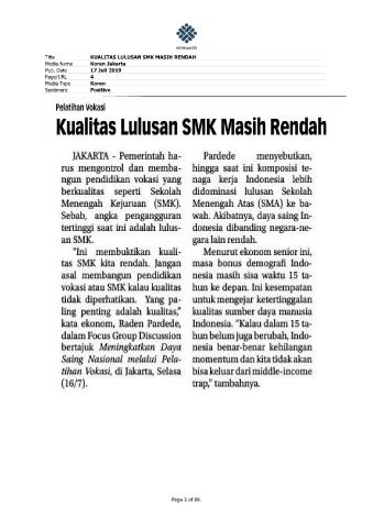 Title KUALITAS LULUSAN SMK MASIH RENDAH Media Name Koran Jakarta Pub. Date 17 Juli 2019 Page/URL 4 Media Type Koran Sentiment Positive Page 3 of 89.