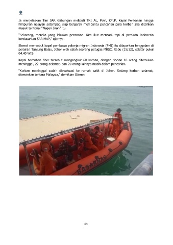 Kapal berbahan fiber tersebut mengangkut 60 korban, dengan rincian 18 orang ditemukan