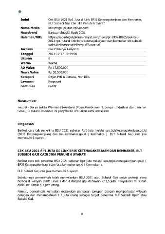 Judul Cek BSU 2021 Rp1 Juta di Link BPJS Ketenagakerjaan dan Kemnaker,