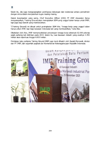 menyampaikan, Training Ground akan menciptakan SDM yang unggul bukan hanya untuk IMIP,