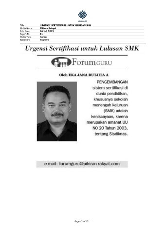 Title URGENSI SERTIFIKASI UNTUK LULUSAN SMK Media Name Pikiran Rakyat Pub. Date 26 Juli 2019 Page/URL 11 Media Type Koran Sentiment Positive Page 12 of 121.