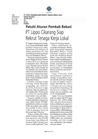 Title PT LIPPO CIKARANG SIAP REKRUT TENAGA KERJA LOKAL Media Name Rakyat Merdeka Pub. Date 26 Juli 2019 Page/URL 14 Media Type Koran Sentiment Positive Page 15 of 121.