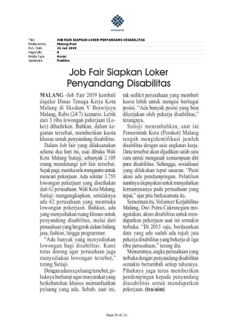 Title JOB FAIR SIAPKAN LOKER PENYANDANG DISABILITAS Media Name Malang Post Pub. Date 25 Juli 2019 Page/URL 8 Media Type Koran Sentiment Positive Page 29 of 121.