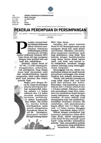 Title PEKERJA PEREMPUAN DI PERSIMPANGAN Media Name Bisnis Indonesia Pub. Date 11 Maret 2020 Page/URL 18 Media Type Koran Sentiment Negative Page 4 of 117.