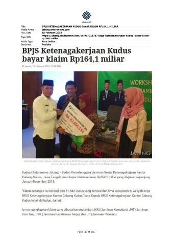 Title BPJS KETENAGAKERJAAN KUDUS BAYAR KLAIM RP164,1 MILIAR